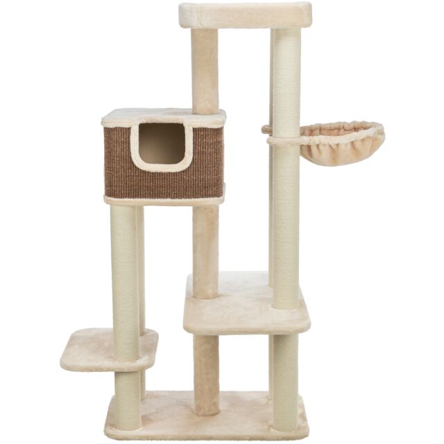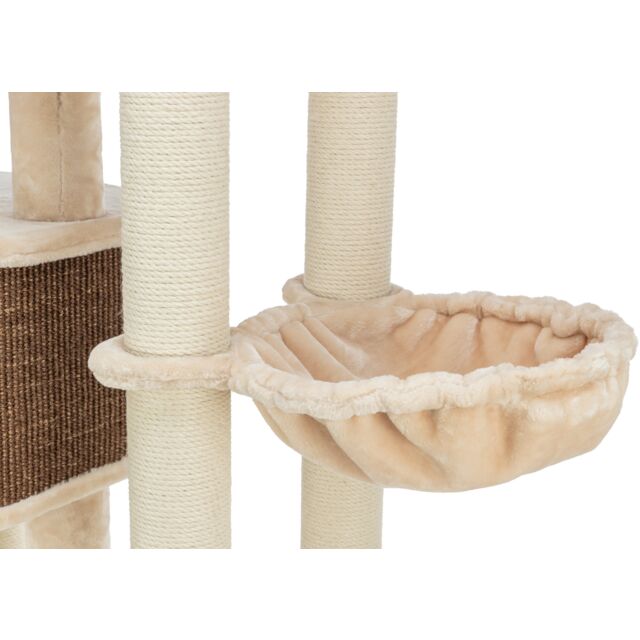 Øverst findes en dejlig seng med en polstret kant, der giver en tryg og hyggelig hvileplads, hvor katten føler sig sikker og godt støttet. Træet indeholder også en separat sisalbeklædt kradseflade, der fremmer passende kradseadfærd og hjælper med at holde kløerne sunde.
