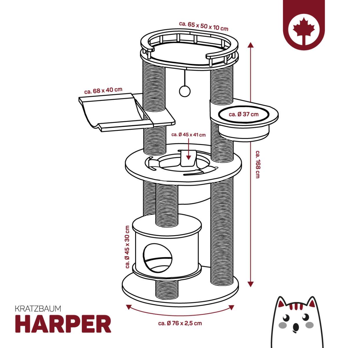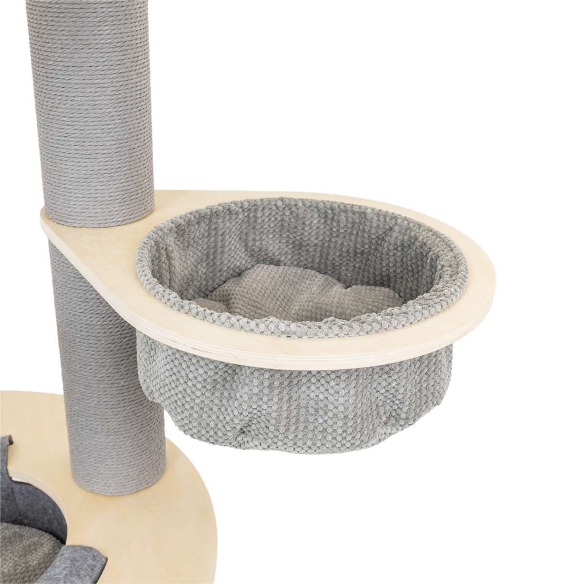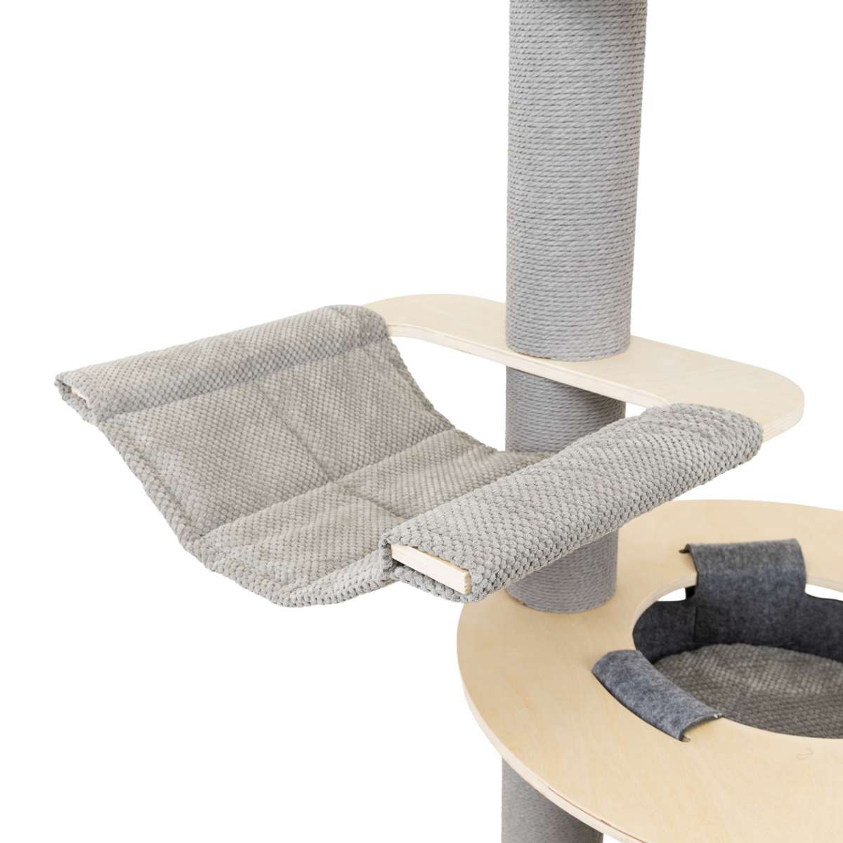 Harper er bygget med fokus på holdbarhed og er udstyret med tykke søjler omviklet med sisal – uimodståelige som kradseposter. Dette beskytter dine møbler, samtidig med at katte kan strække sig og markere deres territorium naturligt. Hvert niveau er polstret med blød, syntetisk pels, som skaber hyggelige hvilesteder og udsigtsposter. De hævede platforme tilfredsstiller kattens instinkt for at overvåge omgivelserne fra højder.