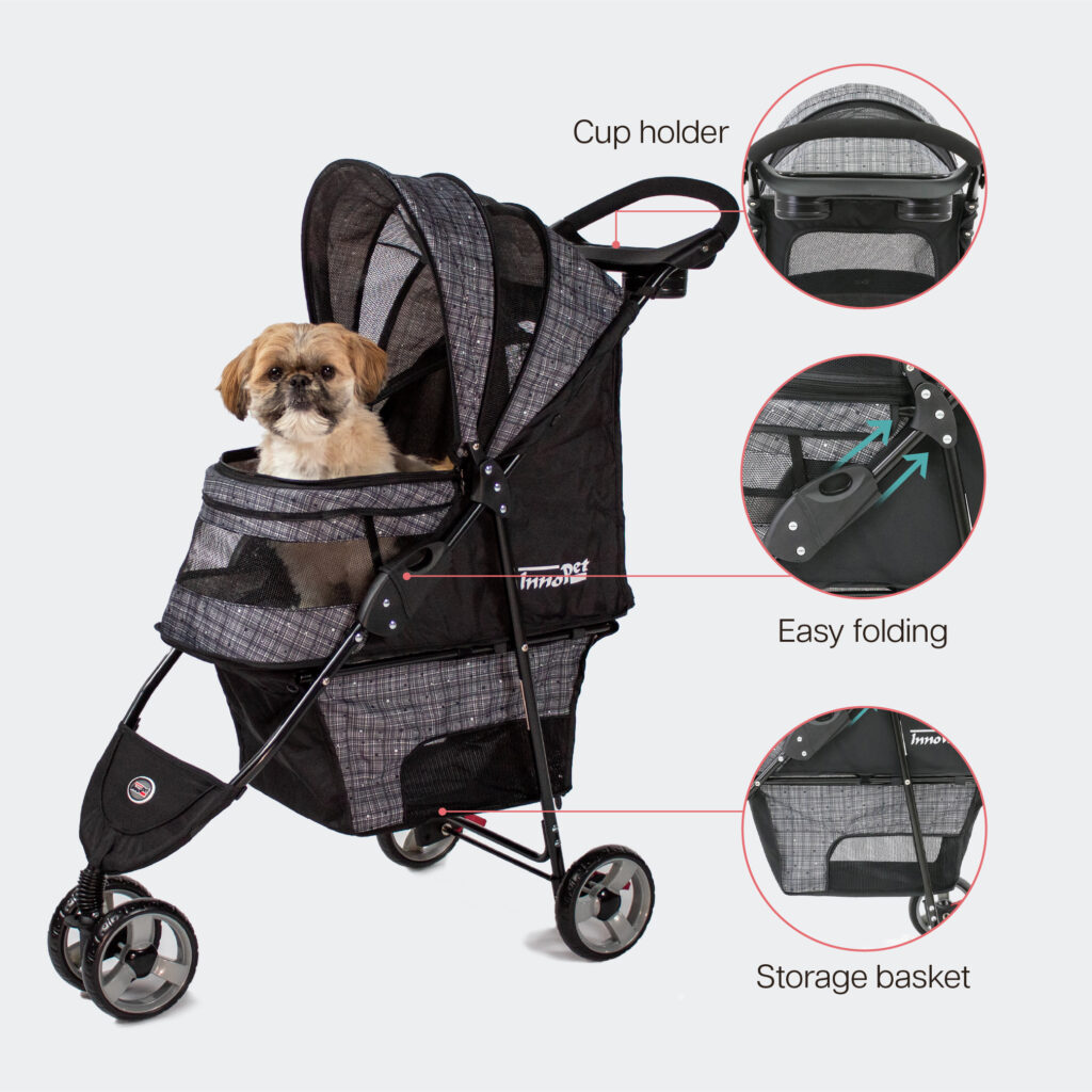 InnoPet Avenue i grå er en slank, let klapvogn skabt til ubesværede byture med små hunde, katte eller hvalpe op til 11 kg. Den kompakte ramme kører glat med et drejeligt forhjul og indbygget affjedring, så turen forbliver behagelig på fortove og i parker. Den sikre kaleche med netpaneler giver frisk luft og godt udsyn, mens en diskret forstærkning foran øger stabilitet og sikkerhed. Indvendigt sørger en rummelig kabine med vaskbar pude og to sikkerhedsseler for, at dit kæledyr sidder trygt og komfortabelt, og hverdagsdetaljer som opbevaringskurv, kopholder og pålidelige baghjulsbremser gør turen nem. Med en vægt på omkring seks kilo og et hurtigt fladt fold, passer Avenue i grå nemt i de fleste bagagerum og skabe og giver ro, bekvemmelighed og underspillet stil på hver gåtur.