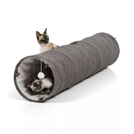For ekstra sjov er der en fristende bold i den ene ende af tunnelen, der opmuntrer katten til at snige sig frem og angribe med begejstring. Når tunnelen ikke er i brug, kan den let foldes flad for nem opbevaring og transport. De integrerede stropper i begge ender gør det muligt at udvide tunnelen – eller forme den som et U – så den tilpasses din kats ønsker og omgivelser.