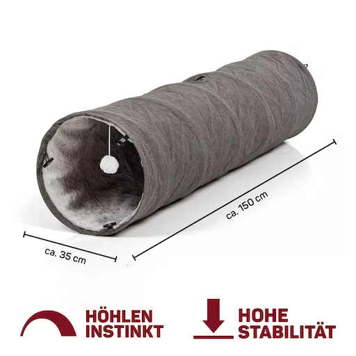 Med sin bløde, plysforede inderside får din stue-tiger en varme og komfort, der overgår forventningerne. Udvendigt er tunnelen beklædt med et slidstærkt stof med hør-look, som sikrer lang holdbarhed og vedvarende glæde. Uanset om din kat ønsker ro og afslapning eller vil udfolde sine jagtinstinkter, opfylder tunnelen alle behov.