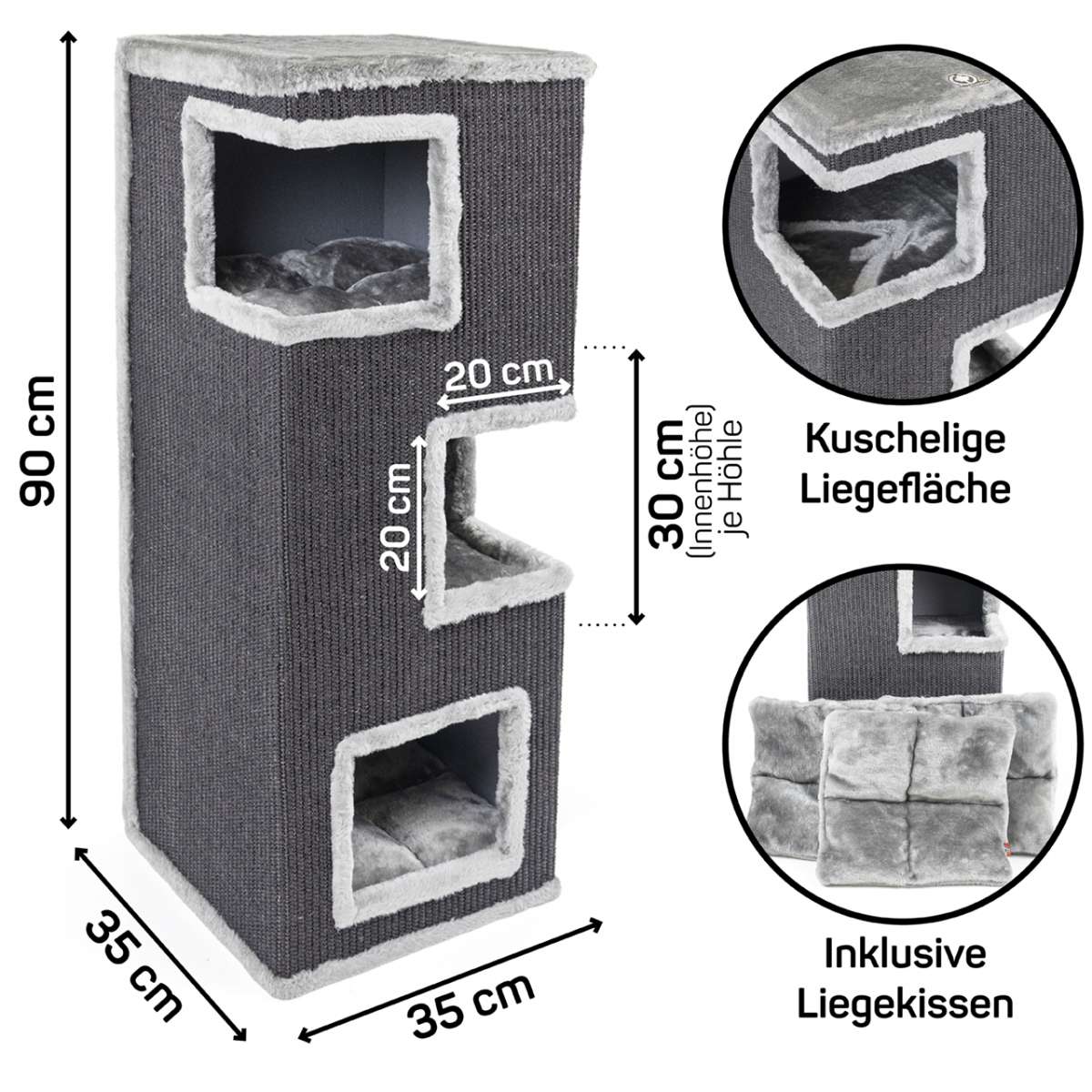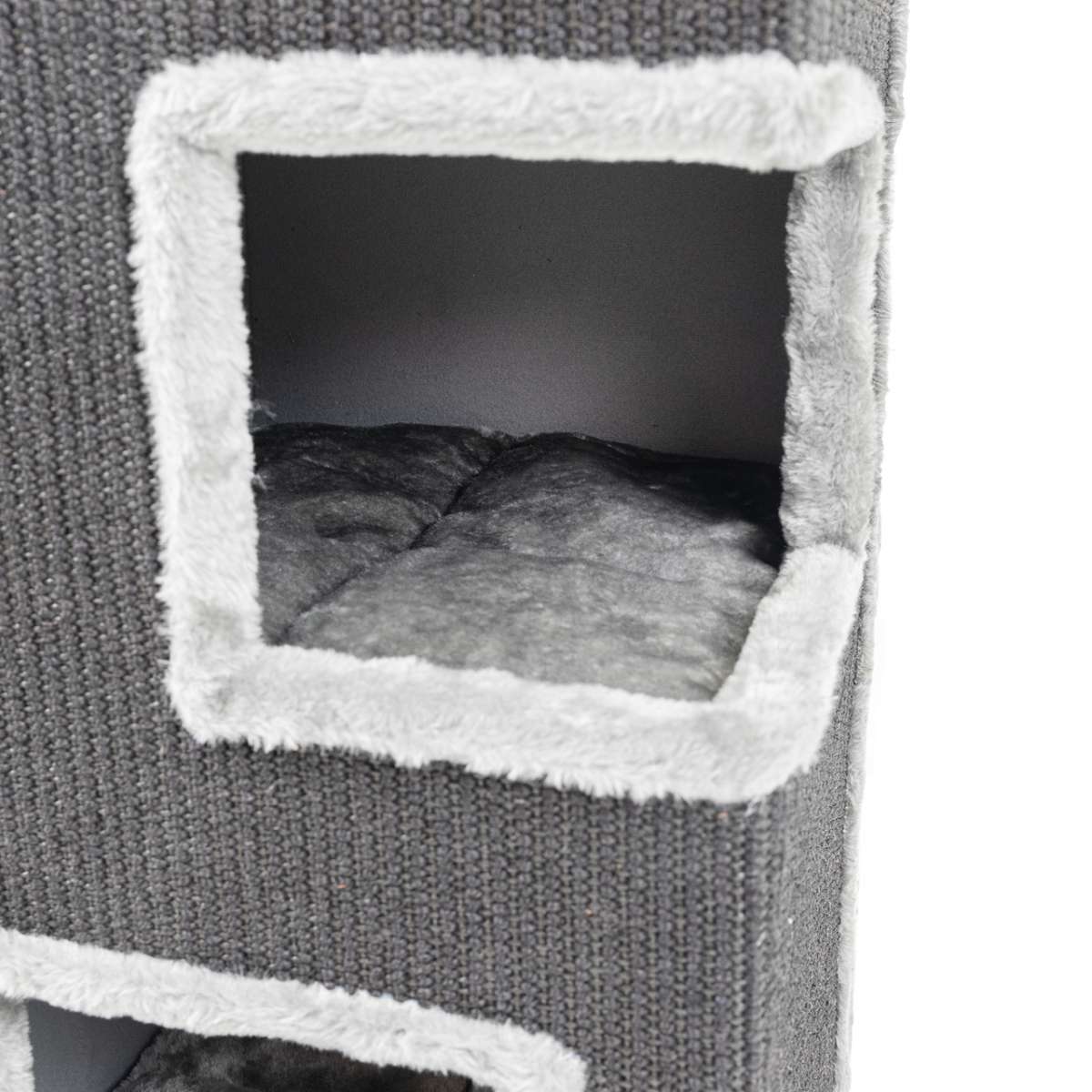 Toppen fuldendes af en blød, polstret udsigtsplads – dækket med blødt antracitfarvet stof – hvor din kat kan holde øje med omgivelserne i fuld komfort. Selvom tårnet er kompakt, er det konstrueret stabilt og sikkert til leg, og det bløde stof gør det til en indbydende hvileplads mellem kradseturene.