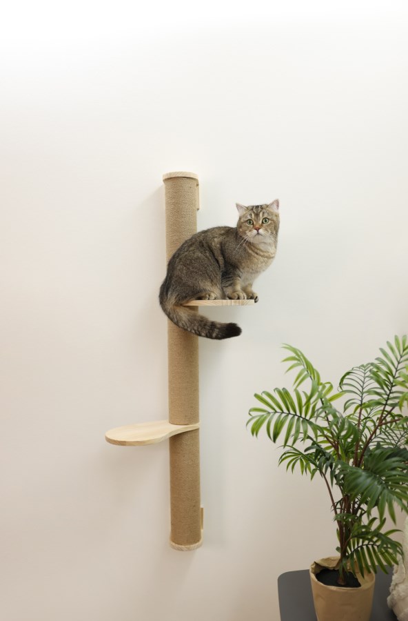 To solide træplatforme på ca. 24,5 × 20 cm hver fungerer som hyggelige hvilesteder og udkigsposter, hvilket gør den velegnet til én eller to katte. Kradsepælen er lavet af kvalitets træ og leveres med alt nødvendigt monteringsudstyr til sikker vægopsætning.
